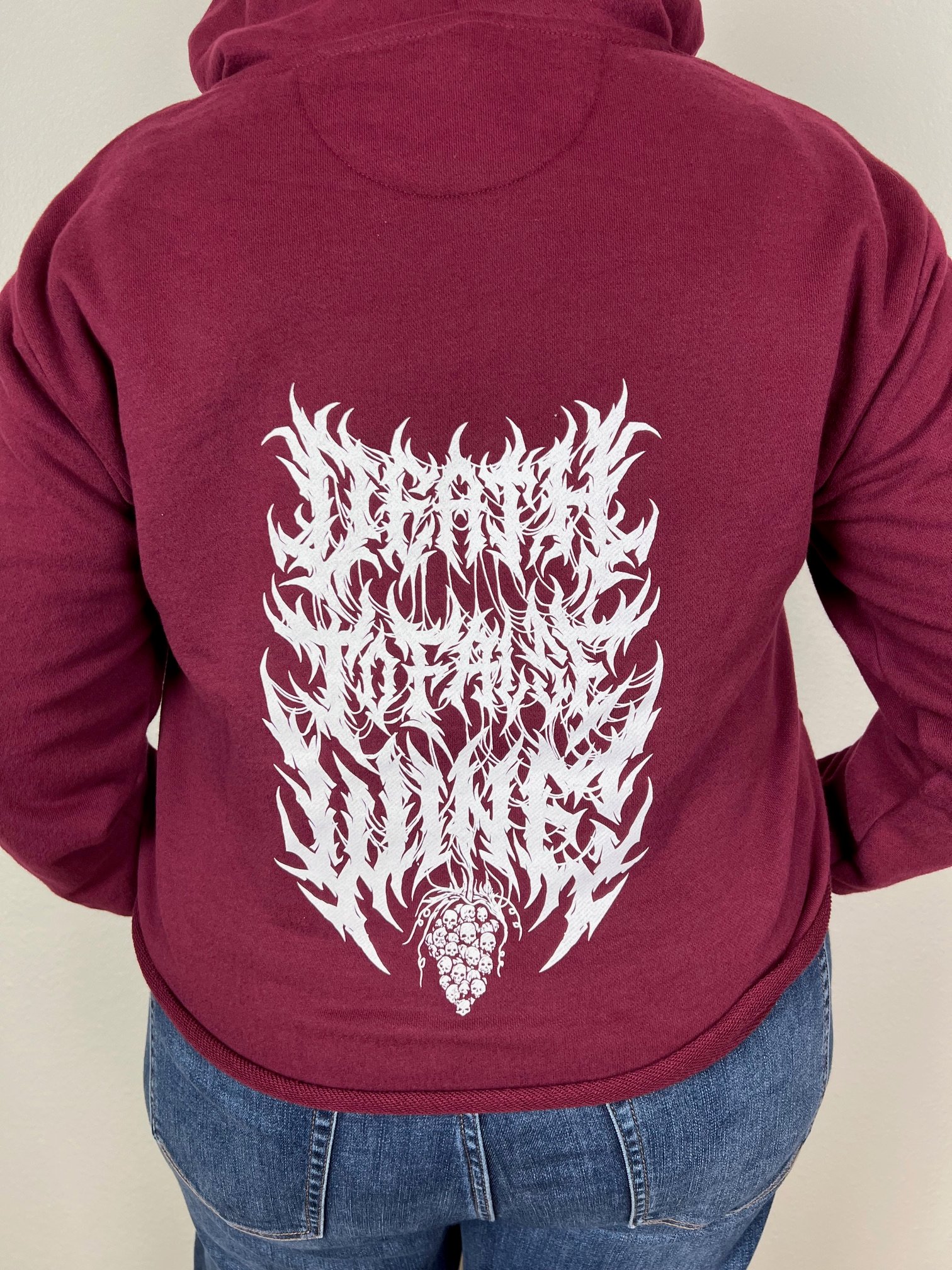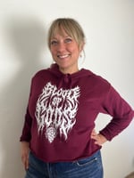 Ultra broooooootal Blood Of Gods logo on the front print, and 'Death To False Wine' printed on the back (Next Level - Women's Laguna Sueded Raw Edge Crop Hoodie)