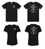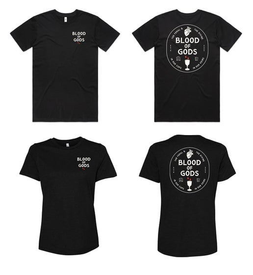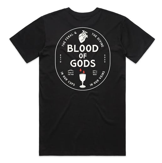 Blood Of Gods logo on the front pocket print, and 'Feral and Divine... In our cups, in our veins' printed on the back (ASColours brand t-shirt).