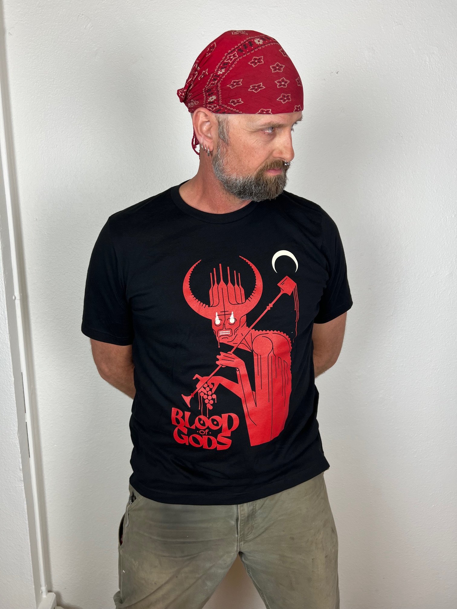Slake Thy Thirst for a brutalicious heavy metal + wine shirt! Wine Lich, designed by Morgan Sorensen, on the front and "Snobs Don't Like It" printed on the back.