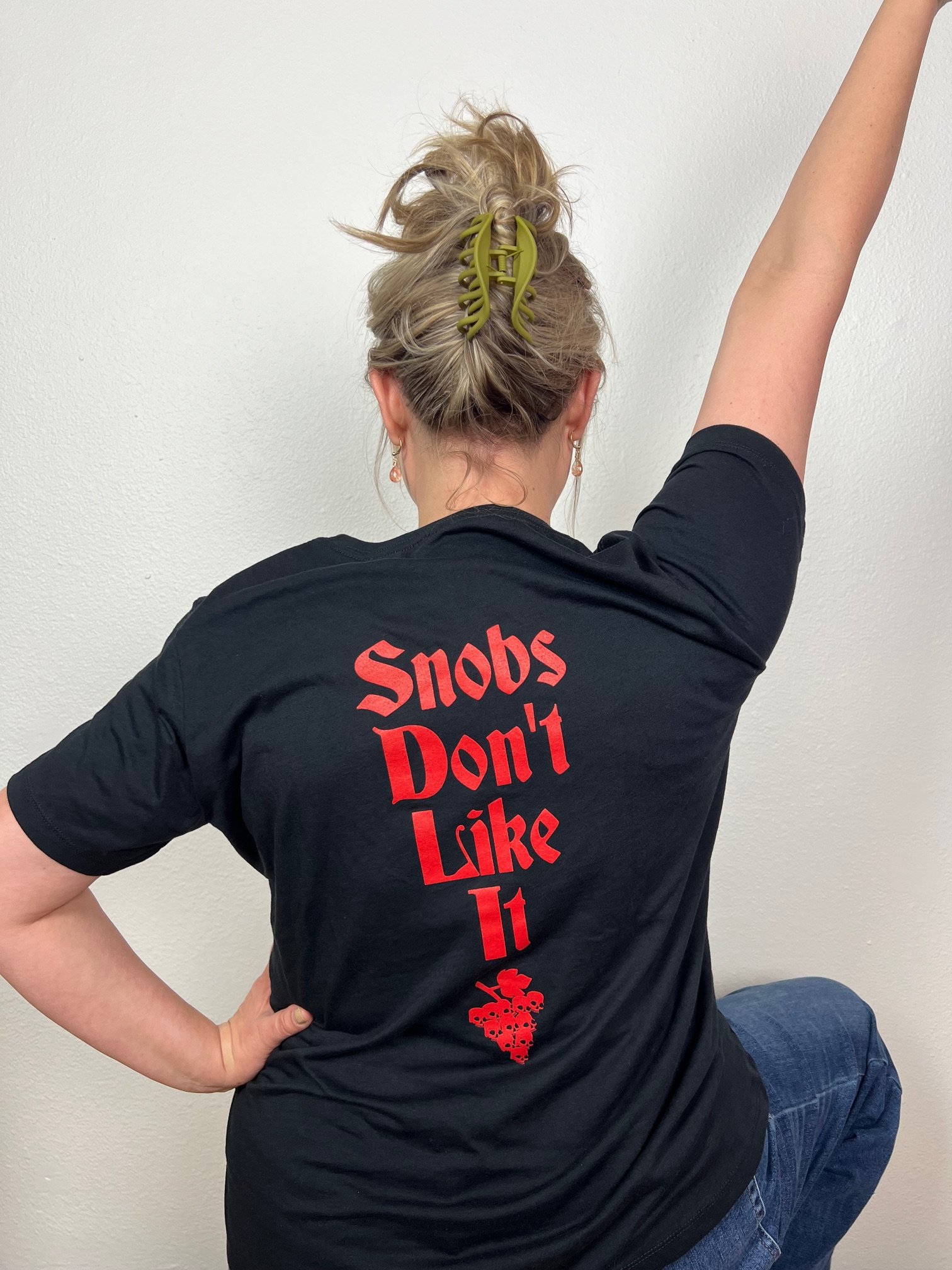 Slake Thy Thirst for a brutalicious heavy metal + wine shirt! Wine Lich, designed by Morgan Sorensen, on the front and "Snobs Don't Like It" printed on the back.